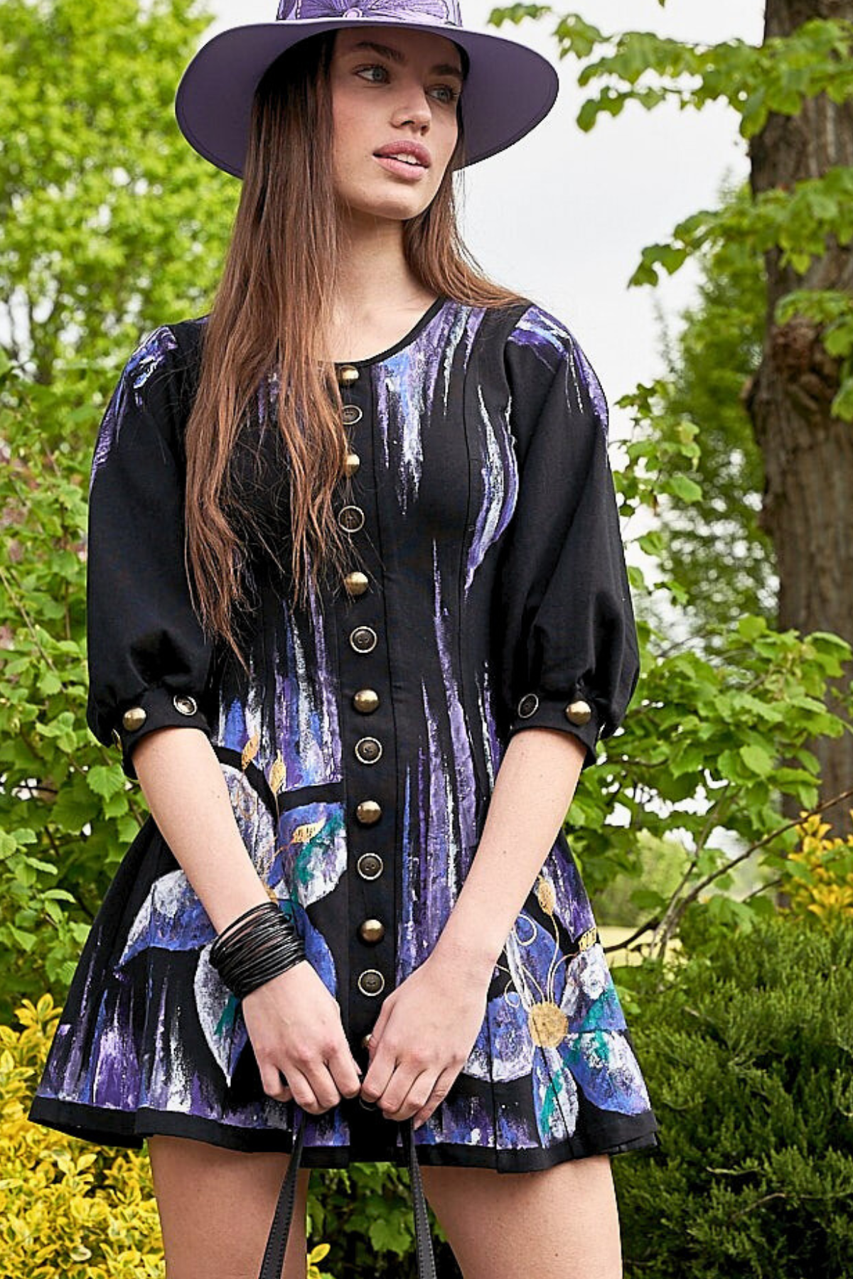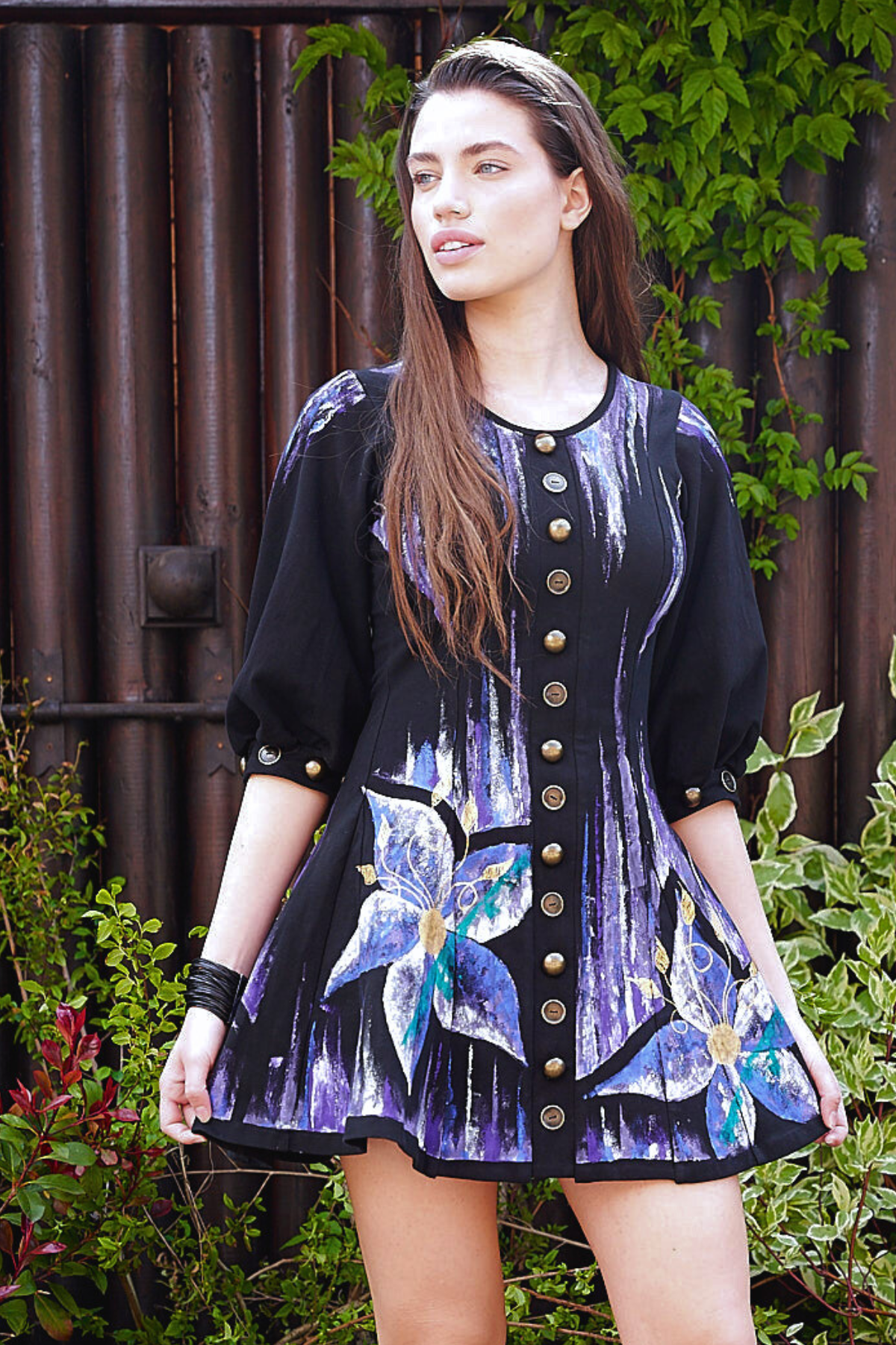 L’abito corto della collezione Flores Guacamaya trasmette la bellezza del “fatto a mano” con meravigliosi dipinti di fiori in tonalità del viola.