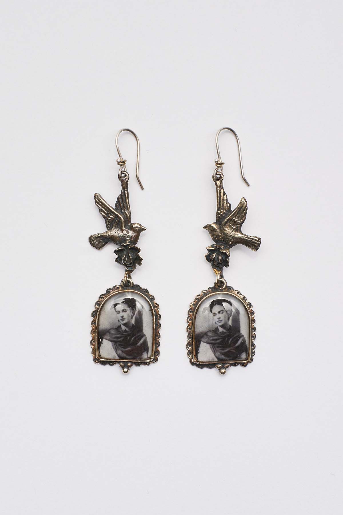 Orecchini in bronzo a gancio con pendente in resina raffigurante Frida Kahlo delicatamente sorretto da una colomba che porta una rosa. Questo raffinato accessorio celebra l'eredità dell'iconica artista e incarna un senso di grazia e creatività. La colomba, simbolo universale di pace, culla delicatamente il ritratto di Frida mentre la rosa da un tocco di romantica eleganza completando perfettamente il design intricato.