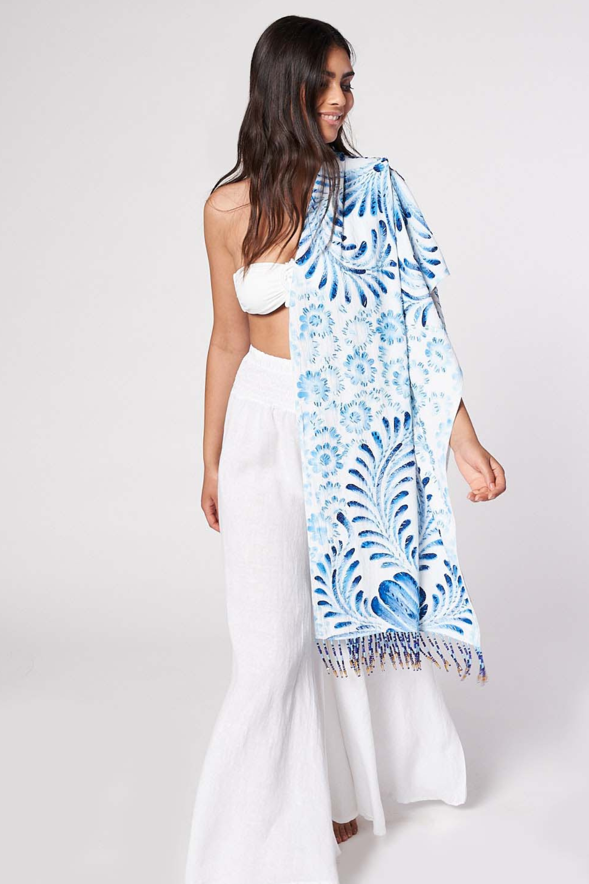 Lo scialle della collezione Talavera Azul crea un look fresco ed elegante con meravigliosi dipinti di Talavera nelle tonalità del blu.