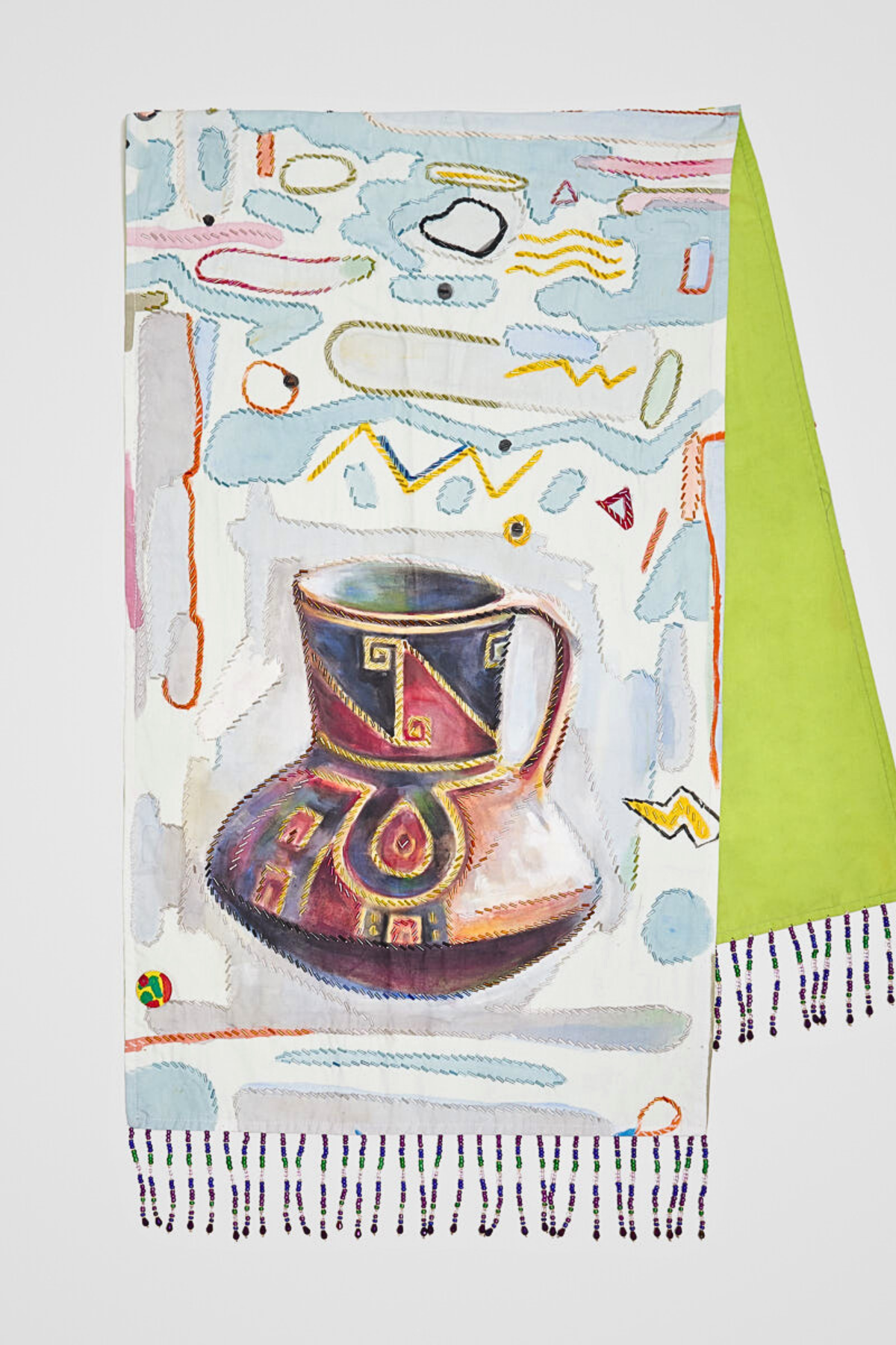 HAND-PAINTED AND HAND-EMBROIDERED SHAWL WITH BEADED FRINGE - ZAPOTECA CERAMIC